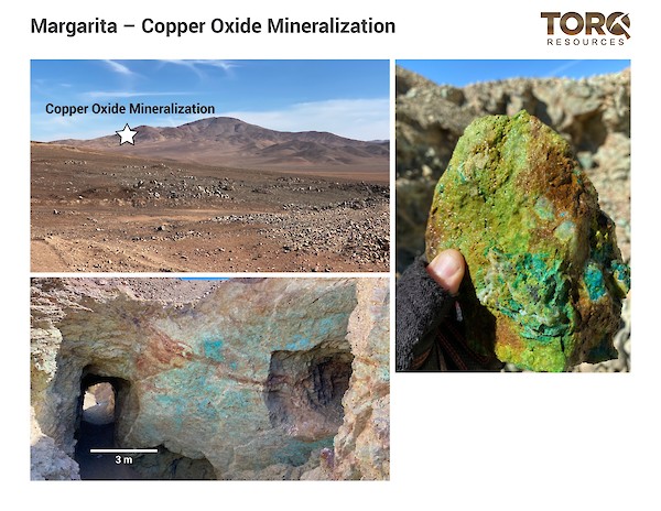 The project is comprised of approximately 1,045 hectares and is flanked by secondary copper oxide mineralization on the southwestern boundary of the property (Figures 2-3). This copper oxide mineralization is defined by 39 drill holes totaling 3,984 metres (m). The presence of the oxide mineralization is important as it demonstrates the potential for the primary copper sulphide source to occur within the Margarita property as no copper sulphide mineralization has been found on the property to-date. The geological and geophysical characteristics of the project suggest the potential for a large-scale copper sulphide target within the property boundaries.