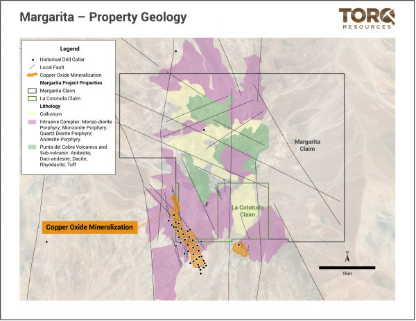 Figure 2: Illustrates the basic property geology of the Margarita project and the location of the copper oxide mineralization that flanks the southwestern margin of the property.