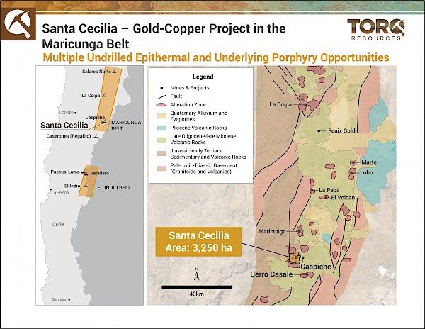 Figure 1: Illustrates the location of the Santa Cecilia project in the southern region of the world-class Maricunga belt, which includes world-class multi-million-ounce deposits such as Salares Norte, La Coipa, Cerro Maricunga, Marte, Lobo, La Pepa, El Volcan, Caspiche and Cerro Casale.