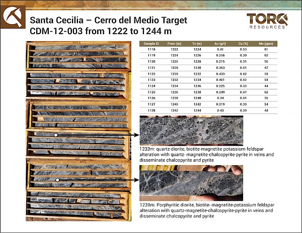 The Santa Cecilia project is characterized by both gold epithermal and gold – copper porphyry styles of mineralization and demonstrates geological similarities to multi-million-ounce deposits in the region, such as La Coipa, Cerro Maricunga and the immediately adjacent Caspiche and Cerro Casale gold – copper porphyry deposits, held by Newmont and Barrick. Torq’s technical team conducted a geological evaluation of the only two drill holes targeting copper porphyry mineralization at Santa Cecilia, drilled into the Cerro del Medio target in the center of the property by the private owner in 2012 (Figures 2 - 3). These two drill holes intersected 925.7 m of 0.21 g/t gold, 0.27% copper and 82 ppm molybdenum (CDM-12-003) and 868.8 m of 0.09 g/t gold, 0.2% copper, and 156 ppm molybdenum (CDM-12-002) and are associated with low resistivity values. Located approximately 500 m apart, drill holes CDM-12-002 and CDM-12-003 intersected mineralization associated with extensive zones of stockwork veining within highly altered volcanic and intrusive rock. Gold-copper-molybdenum mineralization is associated with the strong, multi-phase EB, A, B, and D type porphyry styles of veining recognized (Figures 4 - 5). Both holes are characterized by strong potassic alteration that is locally overprinted by sericite-chlorite or advanced argillic alteration assemblages. Drill hole CDM-12-002 intersected mineralization within a volcanic package of rock, including andesites and tuffaceous units that are within the wall rock of the causative mineralizing intrusions that were intersected in drill hole CDM-12-003, which included quartz diorites, diorites, micro-diorites and igneous and hydrothermal breccia bodies. This is important as it demonstrates the overall strength of the hydrothermal system that pervasively altered the wall rocks in drill hole CDM-12-002 and also points toward additional mineralized porphyry bodies to the east of drill hole CDM-12-003.