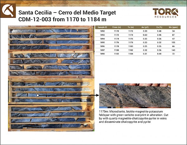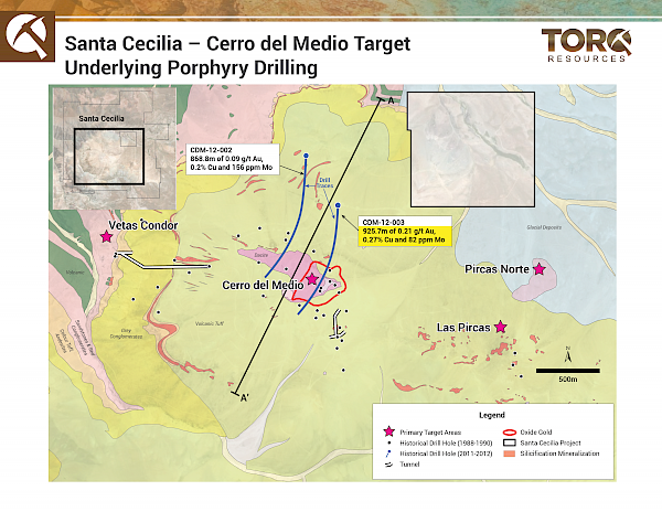 Drill holes CDM-12-002 and CDM-12-003 demonstrate a vertical distance of over 1,200 m of continuous gold-copper-molybdenum-style porphyry mineralization. When combined with additional historical drilling at the Cerro del Medio target that was conducted by a major international mining company in 1988-1990 to define shallow oxide gold epithermal mineralization, the historical data and drill core suggest over 1,500 vertical metres of continuous mineralization (Figures 2 - 3). There is no historical core available from the shallow drilling in 1988-1990, which consisted of approximately 14,000 m. In addition, CDM-12-002 and CDM-12-003 have thus far defined porphyry-style mineralization over 800 m in a north-south direction and 500 min an east-west direction. The initial observations from these two drill holes demonstrate two or three distinct pulses of porphyries and associated mineralization. Importantly, all the known multi-phase porphyry projects and mines in the region have one porphyritic phase with higher grades, which is critical in terms of economic viability. Torq’s technical team believes that, given the outstanding strength and size of the hydrothermal system at Santa Cecilia, one or more higher-grade porphyritic phases will be present. Discovering one of these higher-grade porphyry phases is the primary exploration objective in the coming drill campaigns over this 10 square km hydrothermal alteration system.